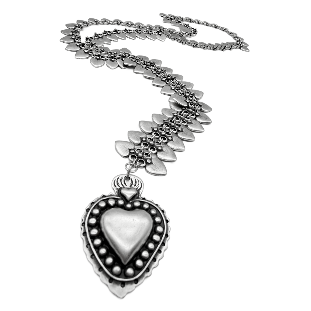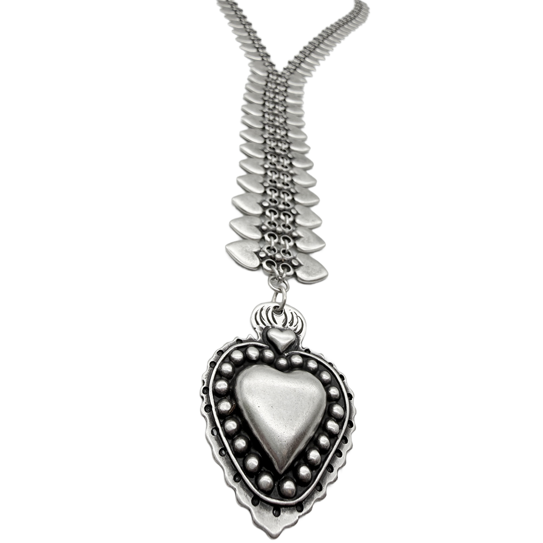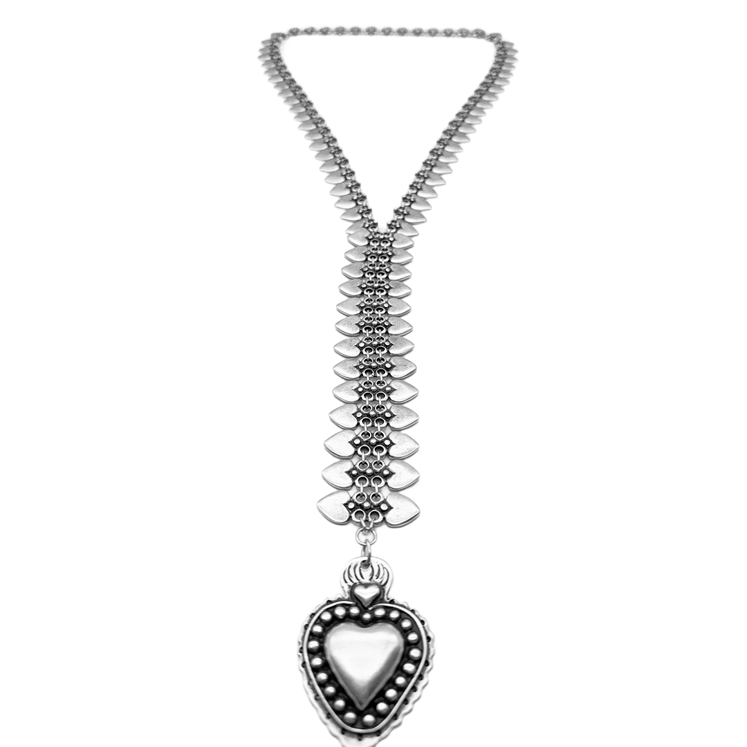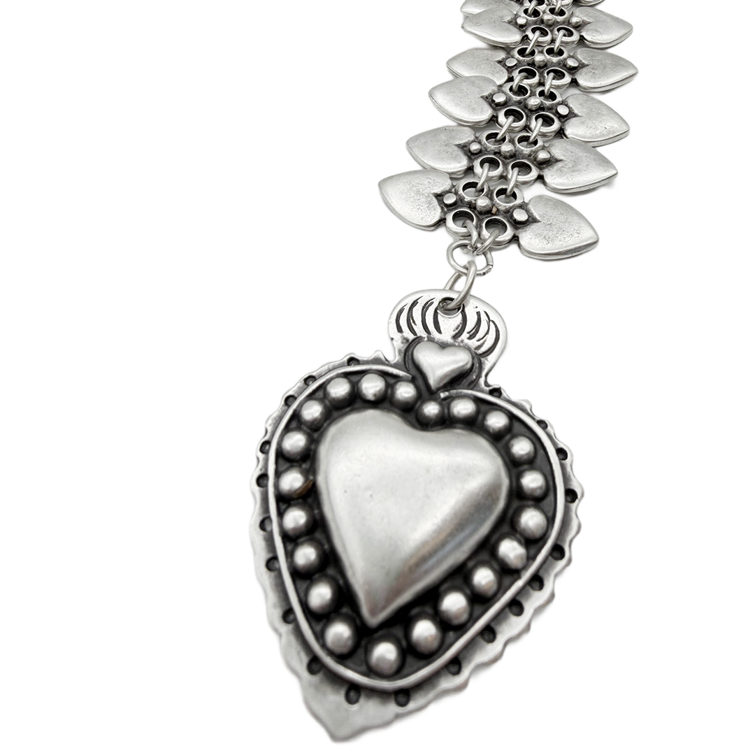 Collar corbatín con cadenas con corazones y dije de Sagrado Corazon